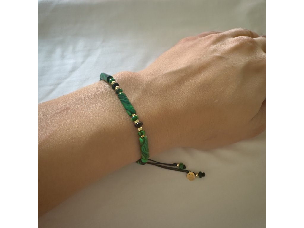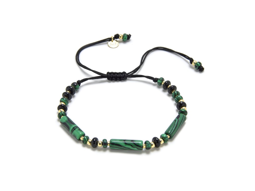 Ručně vyráběný stříbrný náramek s přírodním malachitem a černým achátem. Kameny jsou proloženy drobnými stříbrnými komponenty o ryzosti 925 povrchově pokovenými 14 kt. zlatem a japonskými korálky MIYUKI.